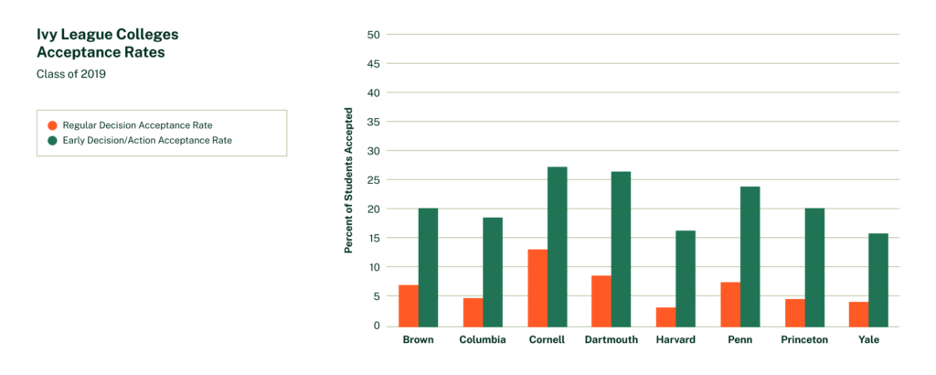 The graph below of the 2019 Ivy League admissions statistics shows a comparison between the Early Decision / Early Action acceptance rates and the Regular Decision acceptance rates: