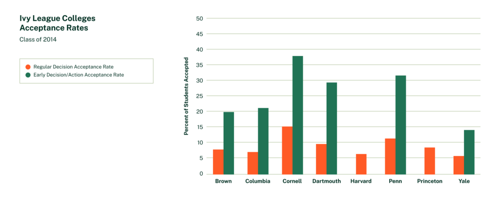 The graph below of the 2014 Ivy League admissions statistics shows a comparison between the Early Decision / Early Action acceptance rates and the Regular Decision acceptance rates: