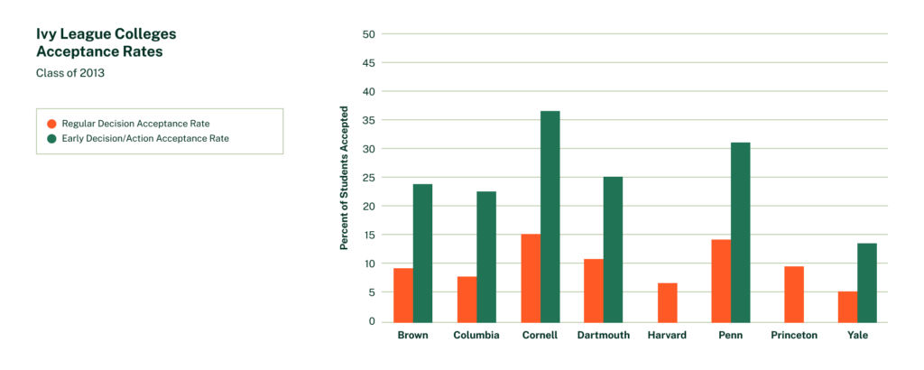 The graph below of the 2013 Ivy League admissions statistics shows a comparison between the Early Decision / Early Action acceptance rates and the Regular Decision acceptance rates: